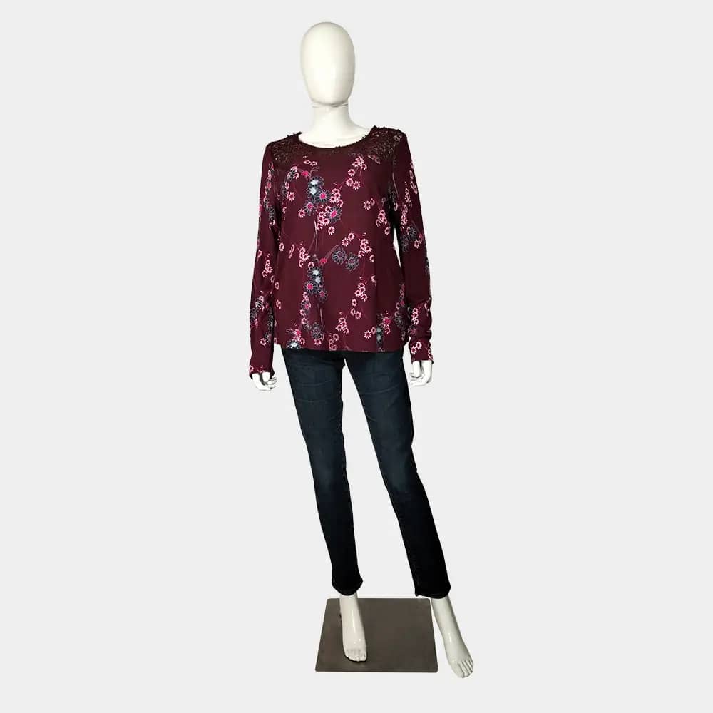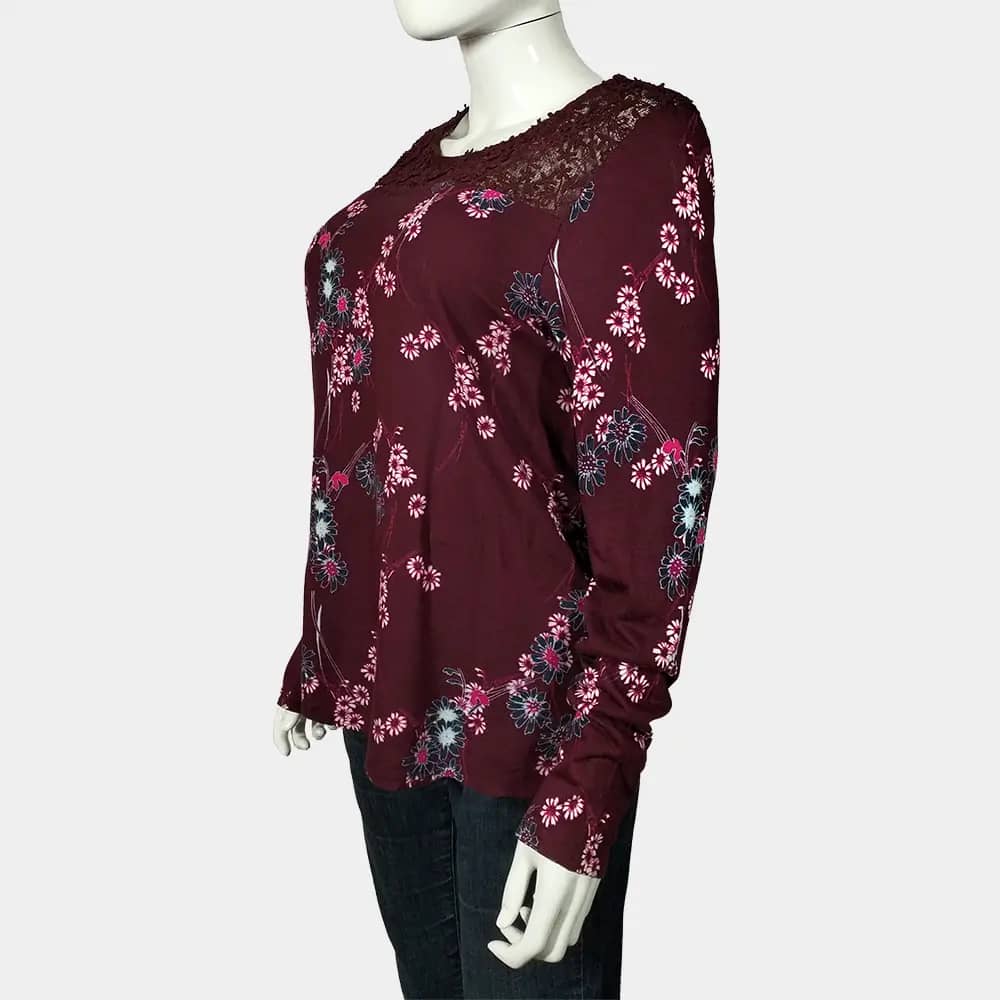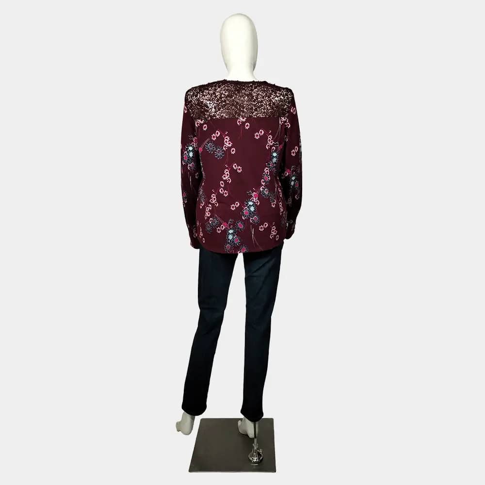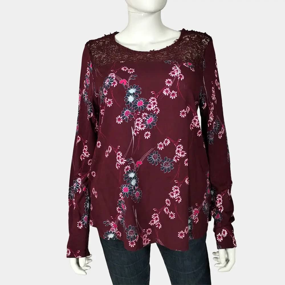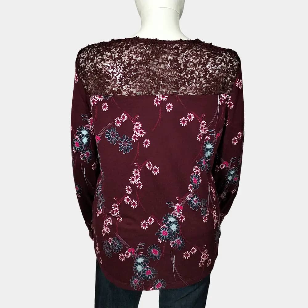 A long sleeve cheery and comfortable lacy yoke top with an intricate lace pattern at the front and back yoke while the body is a 100% viscose fabric. It also has a rounded hemline with side slits.