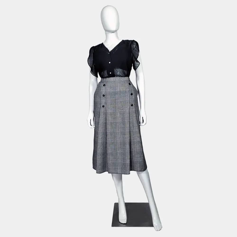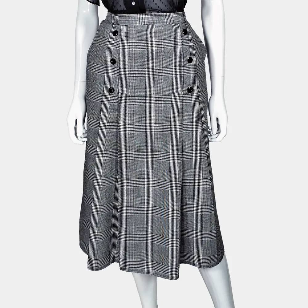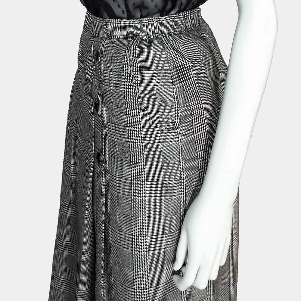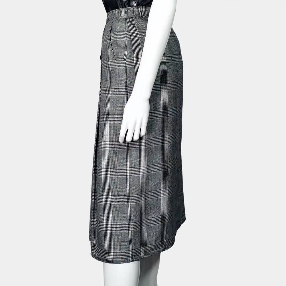 Black and white coloured Canda plaid skirt in a soft fabric blend, featuring 8 black buttons and pleats in the front detail, side pockets and side elasticated waistband for a secure fit. The skirt is slightly flared and long.