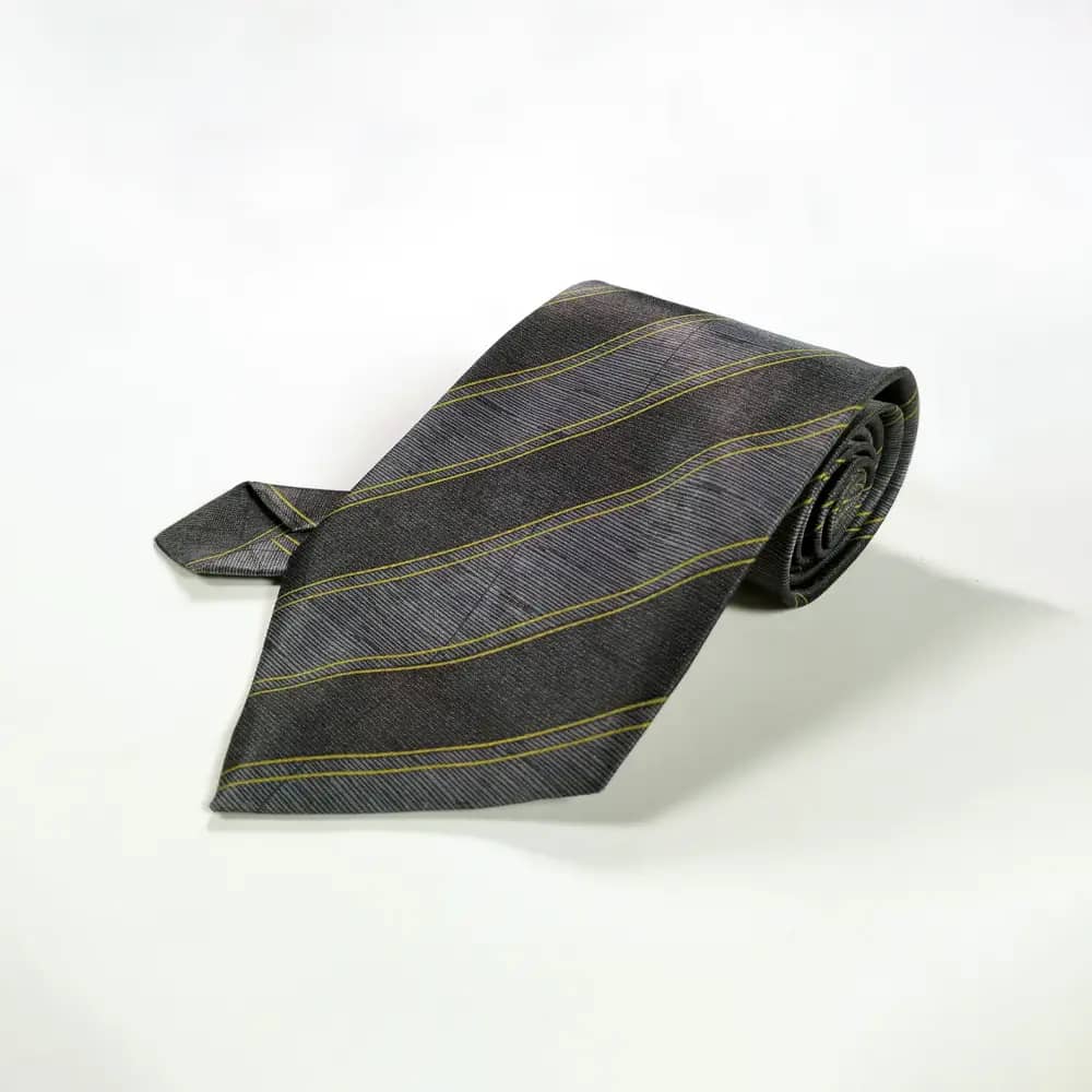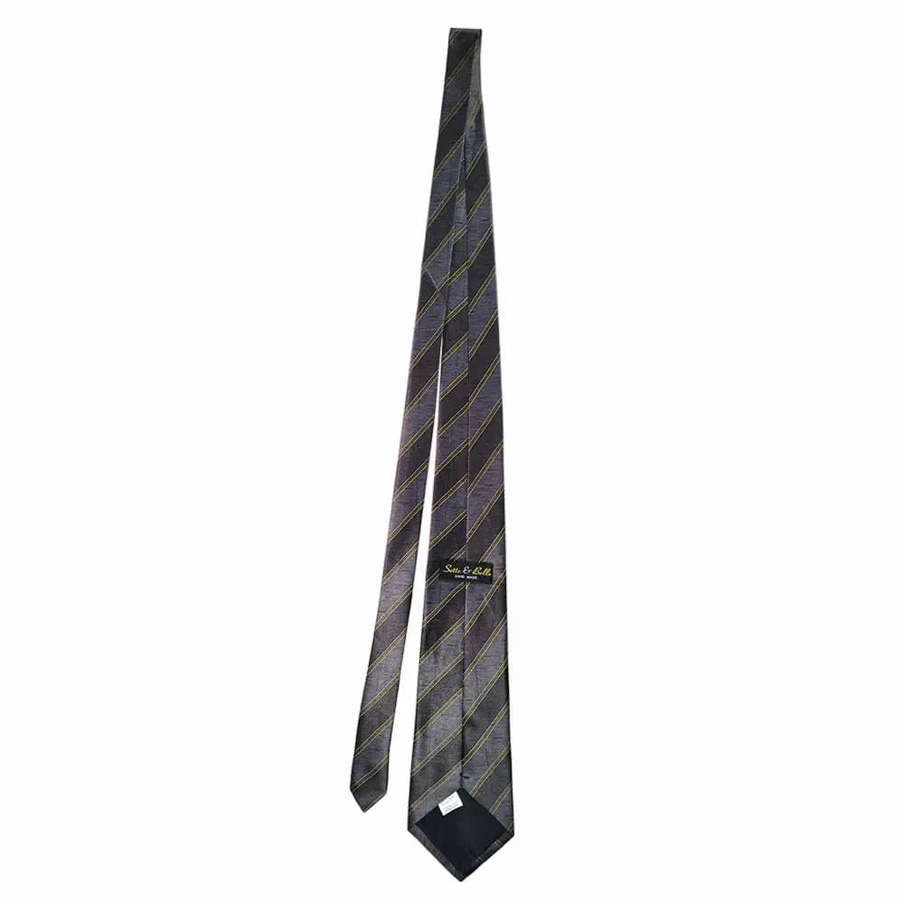 This is a classic Sette and Bello tie. It is a chic black, yellow, and grey striped, 61 inches long polyester tie.