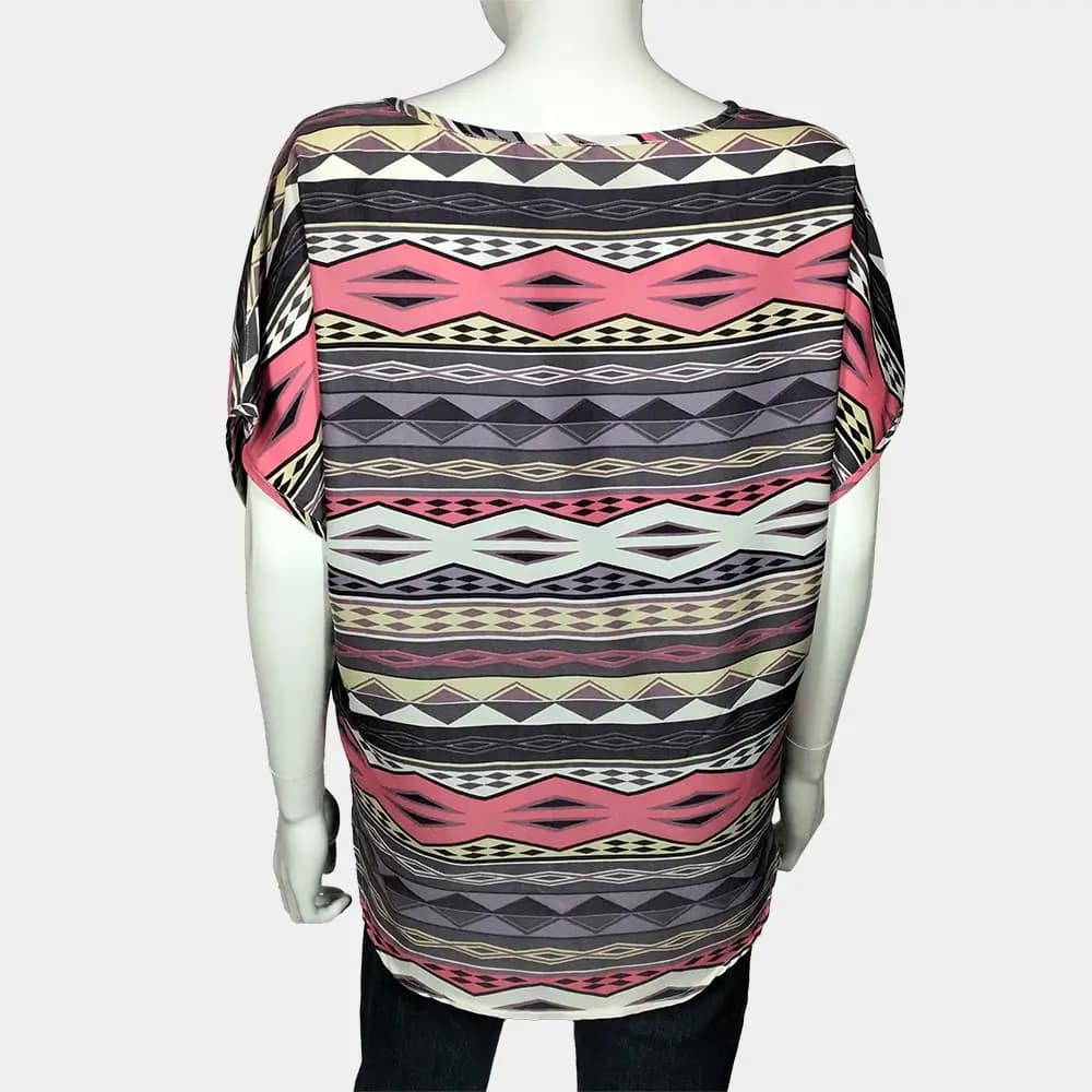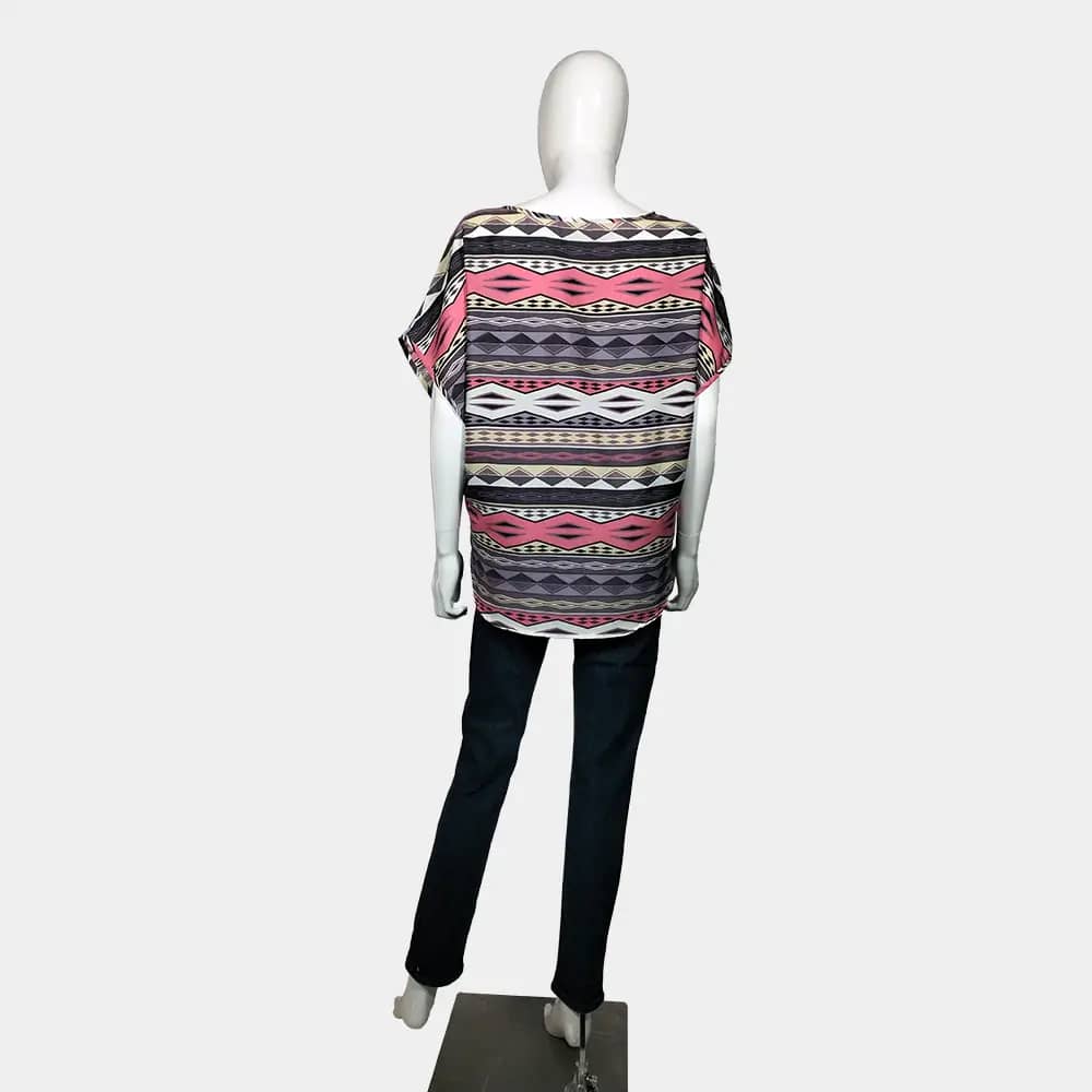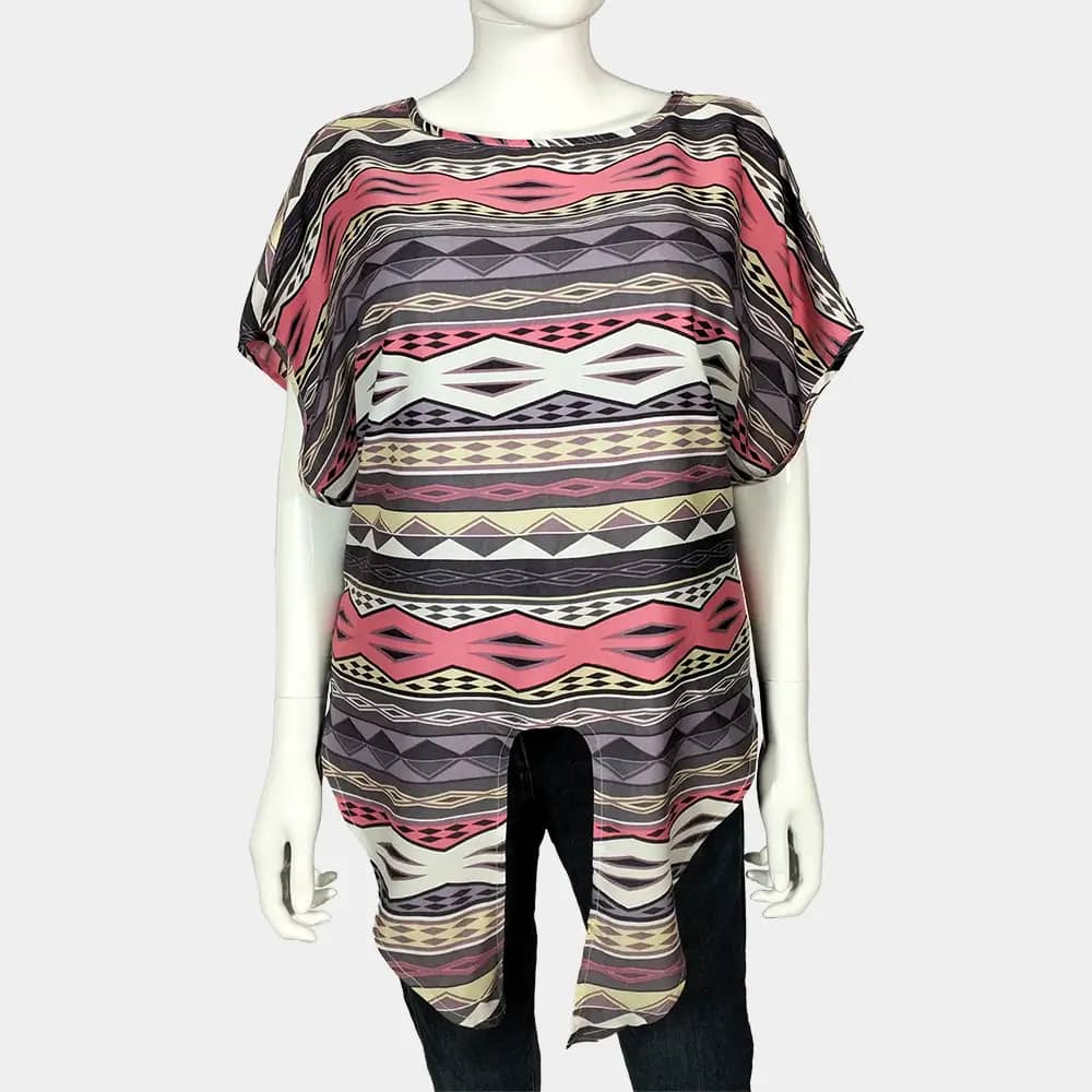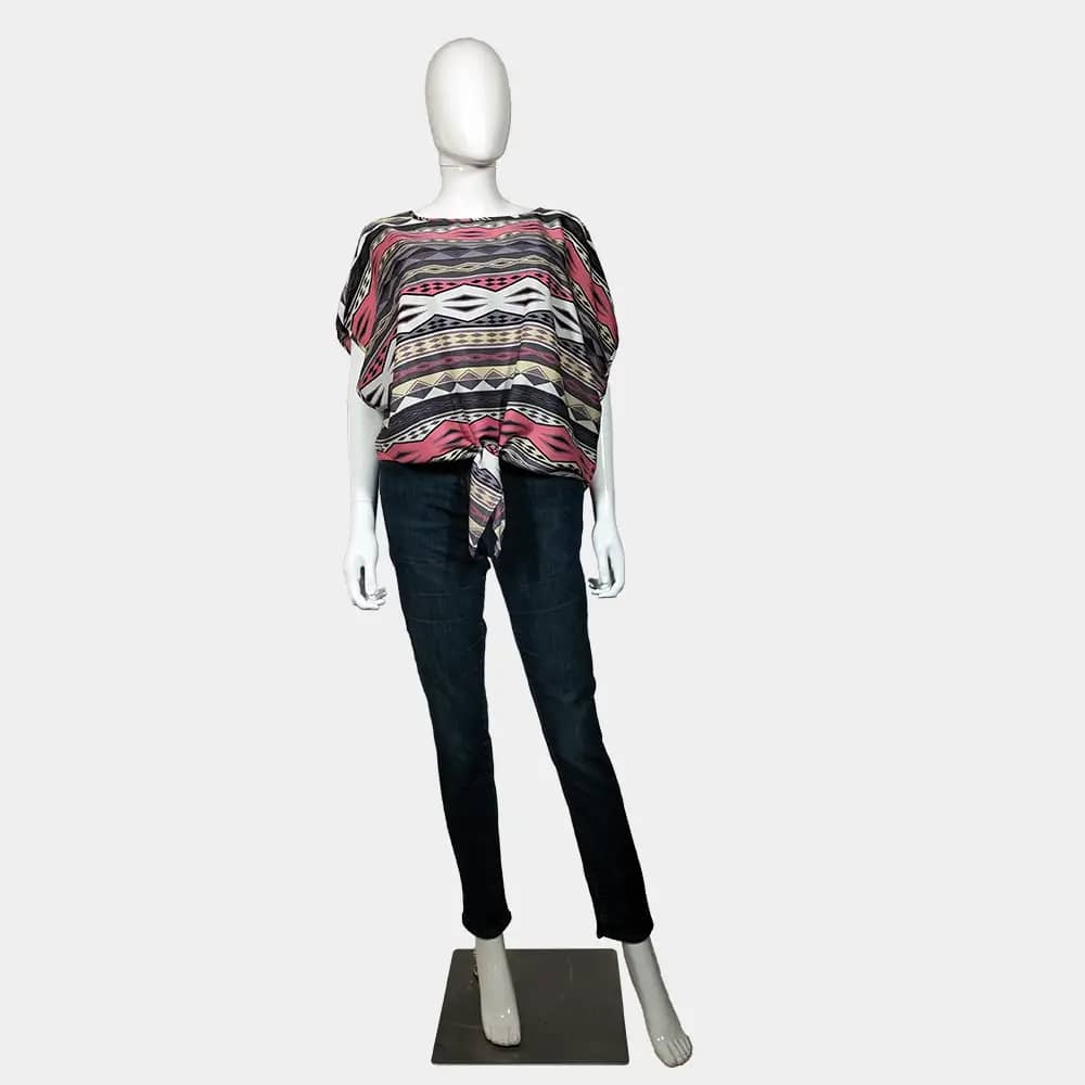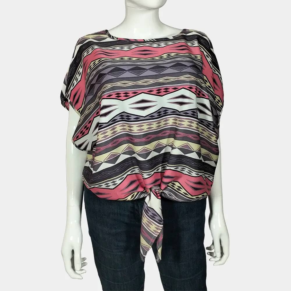 A comfy loose fitted tie-string top with kimono sleeves for a causal look. The material is made of 100% polyester, and the tie string can be styled to give a snug fit at the waist or upper hips.