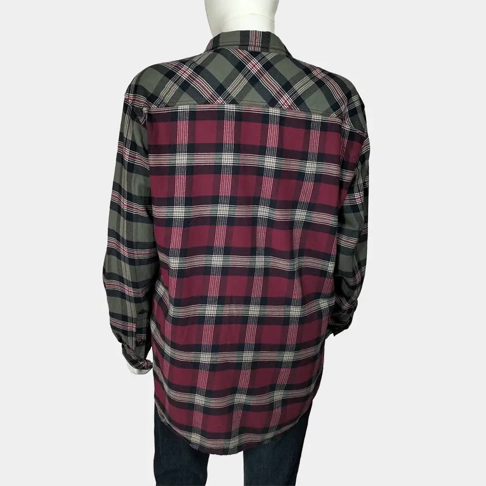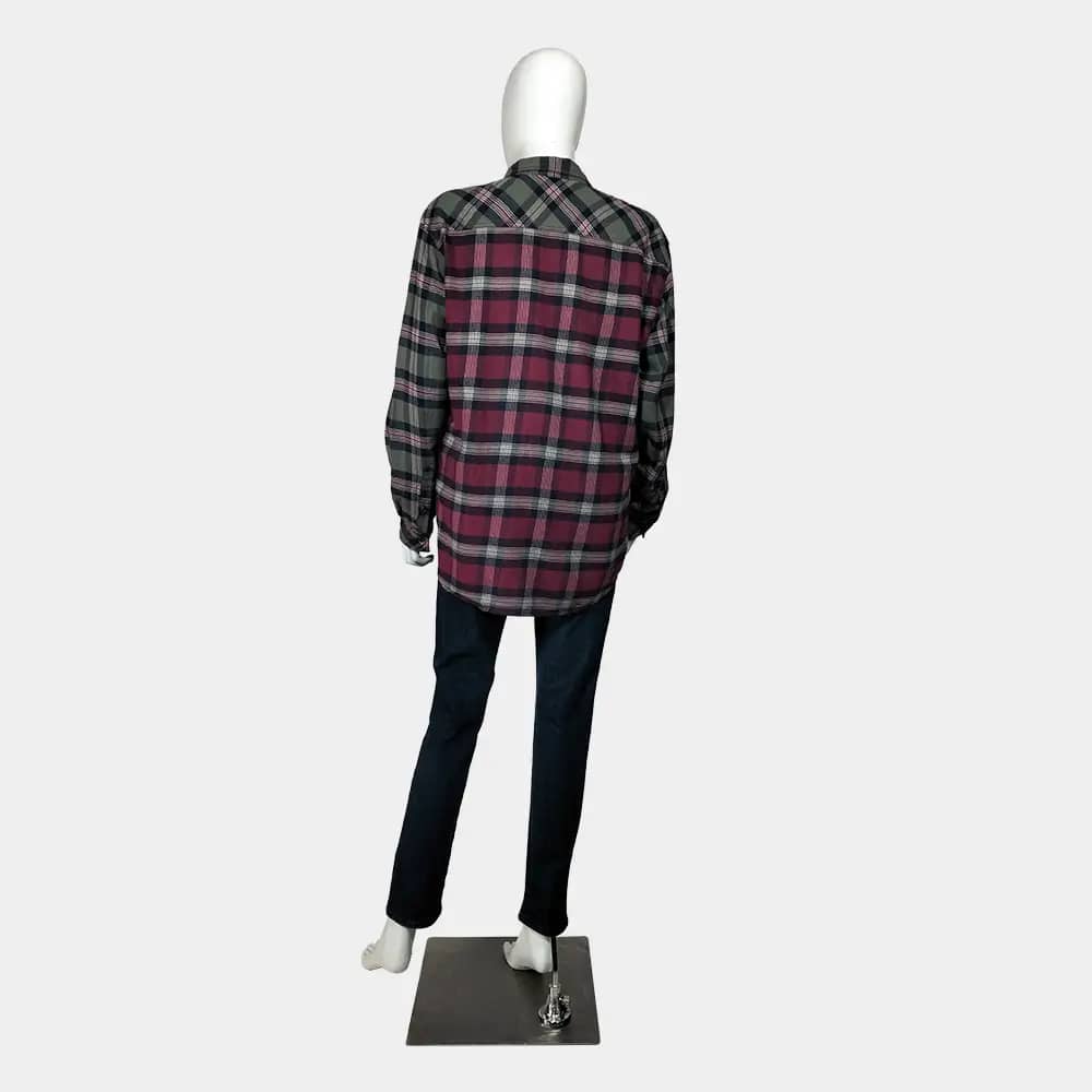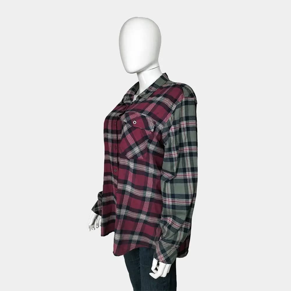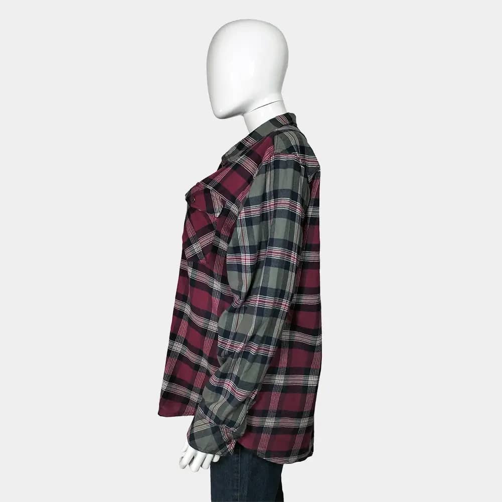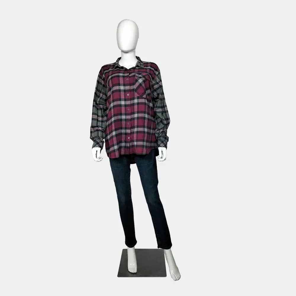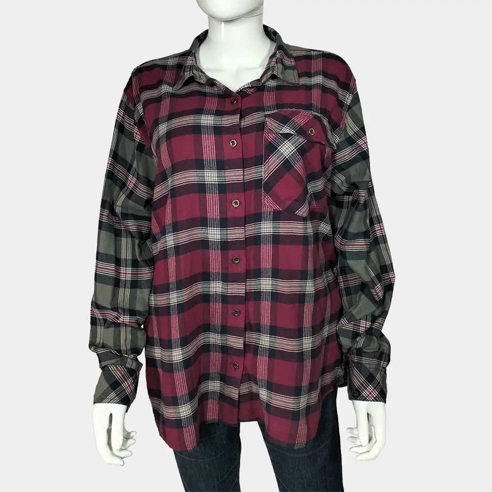 A trendy women’s grunge shirt with dark blue, white, grey and red checked pattern. This long sleeved cotton shirt is a popular fashion statement and includes collar, chest pocket, simple button facing and sleeve cuffs.