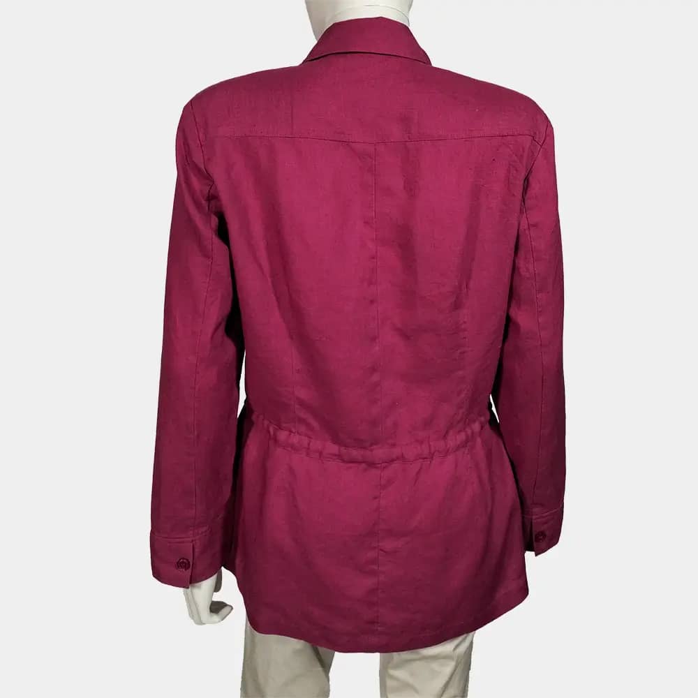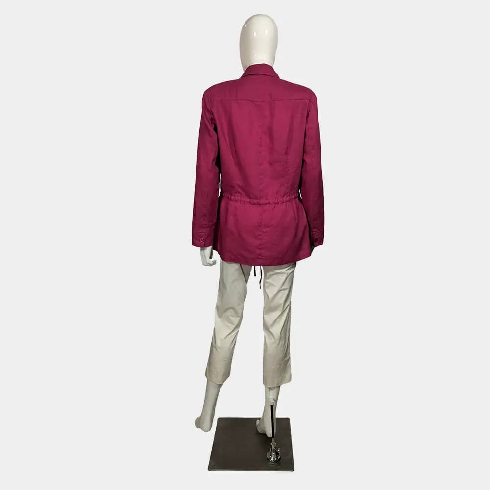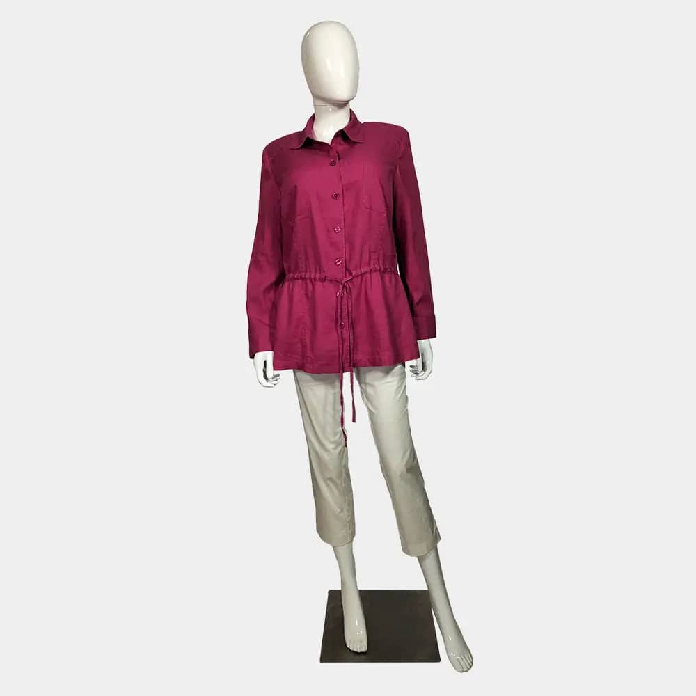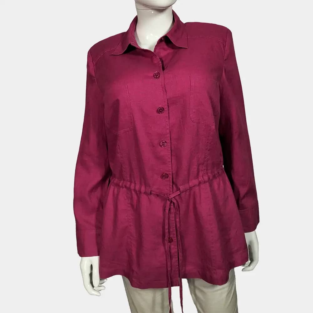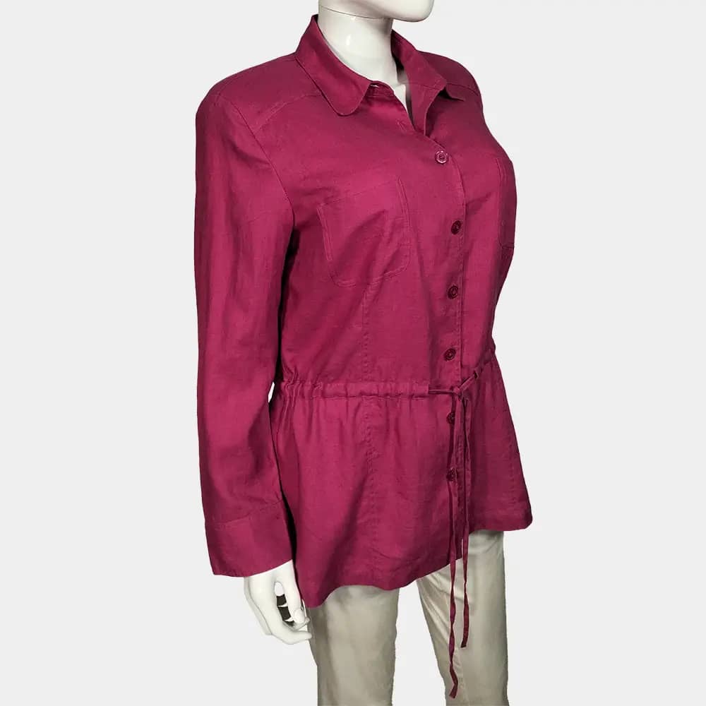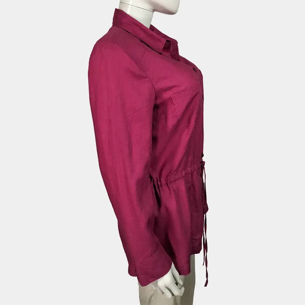 A Crisp Best Connections pink coloured button down, drawstring linen shirt which features two breast pockets, drawstrings at the waist, and long sleeves with cuffs at the wrist.