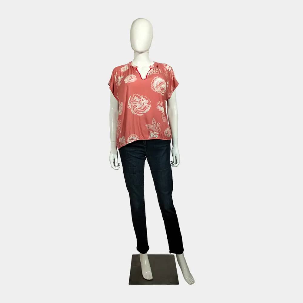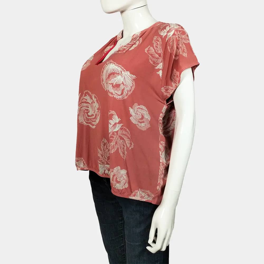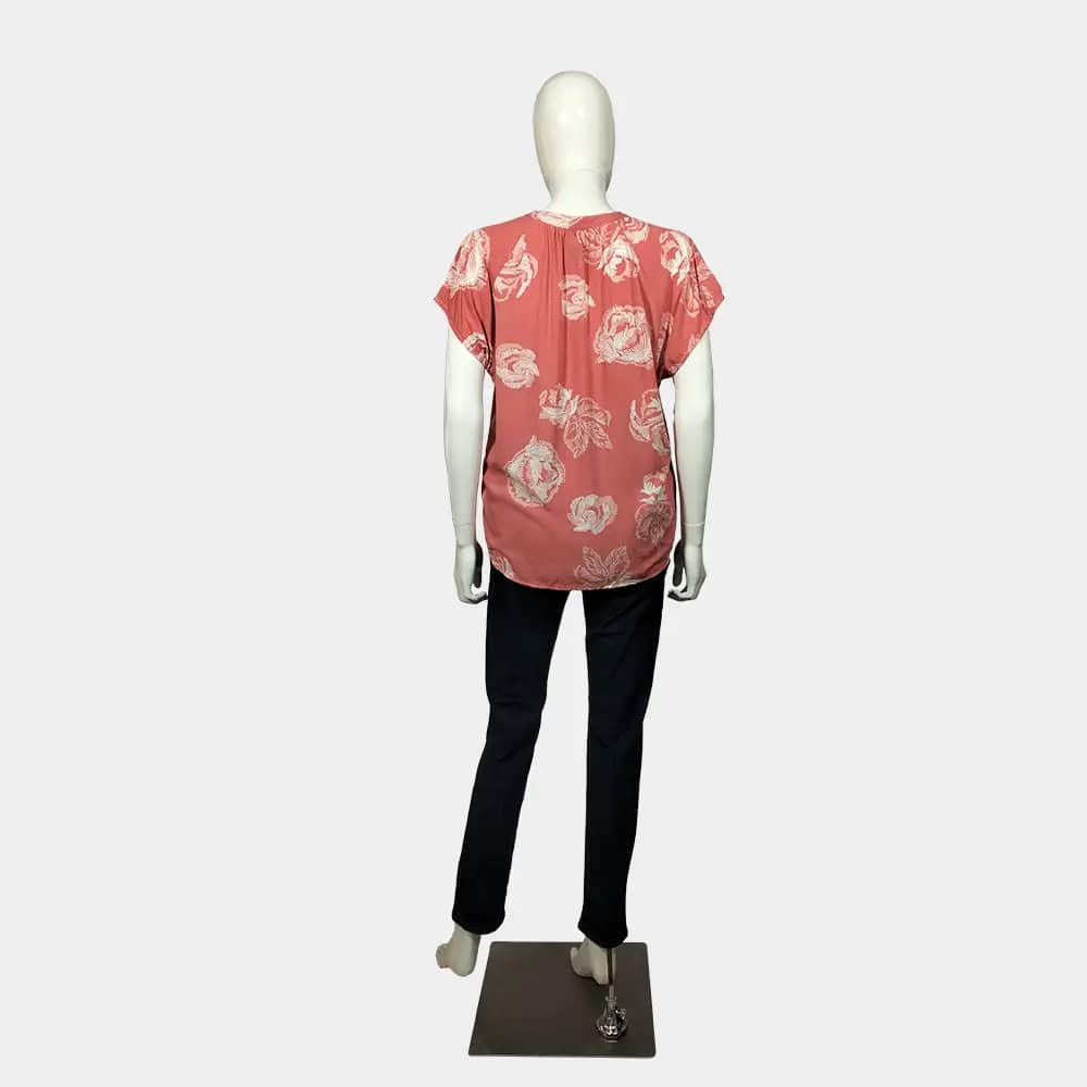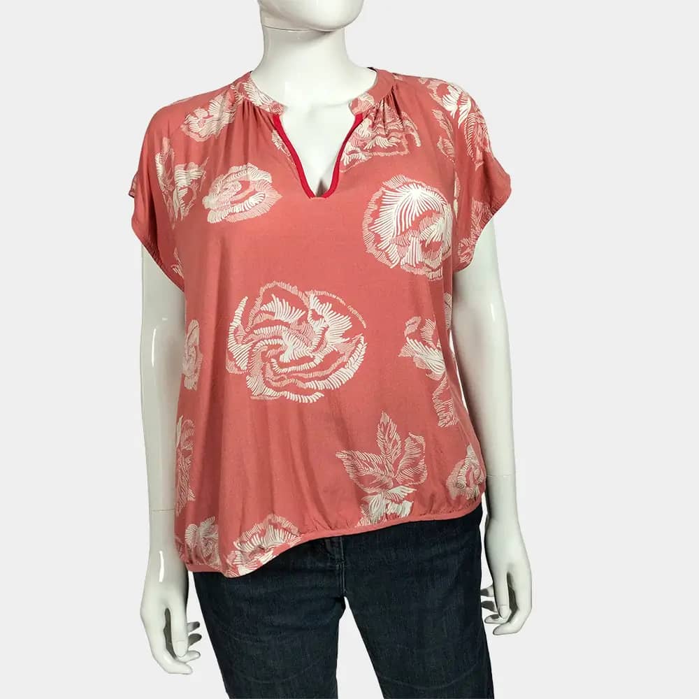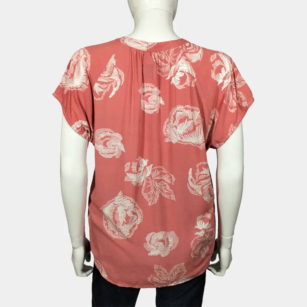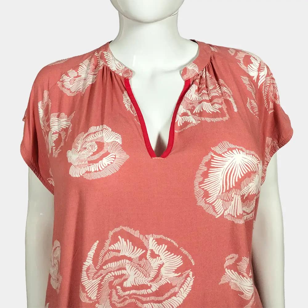 A comfy Culture peach and bold white floral pattern casual V-neck top with a bishop collar and a slightly ruched hemline.