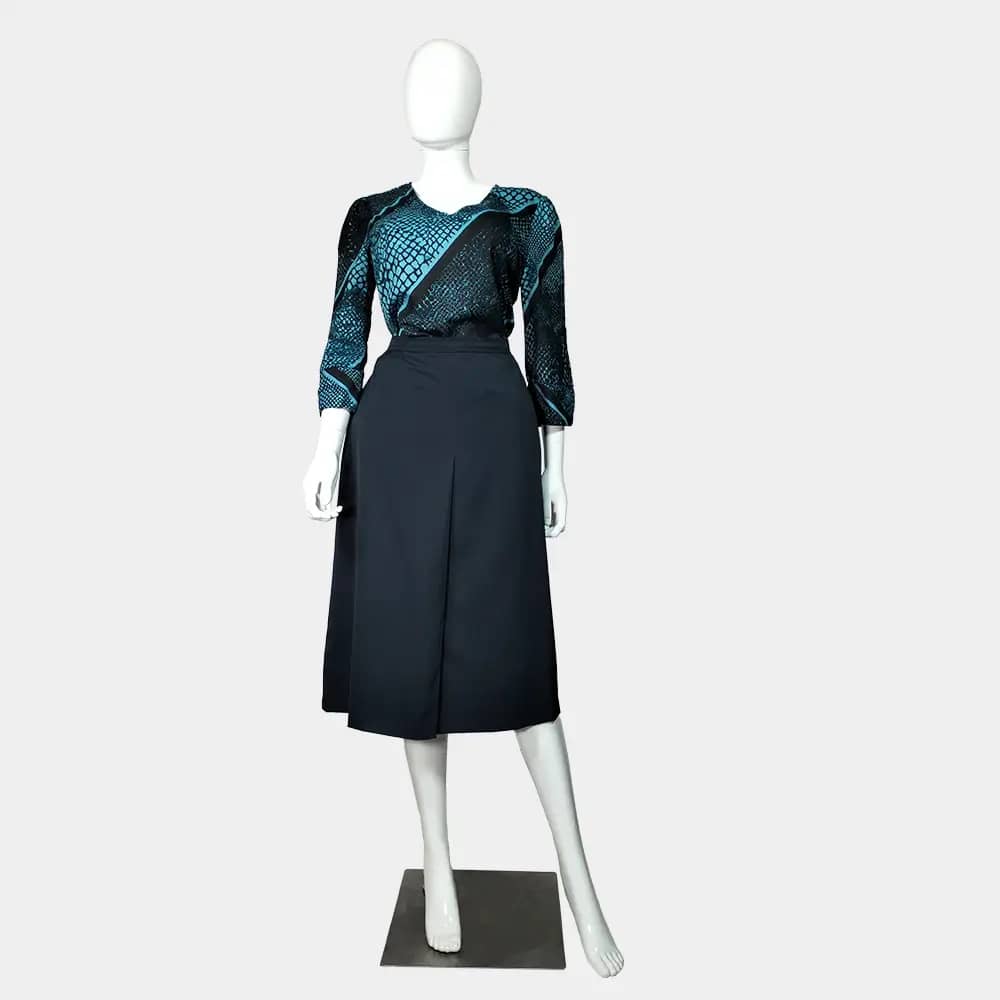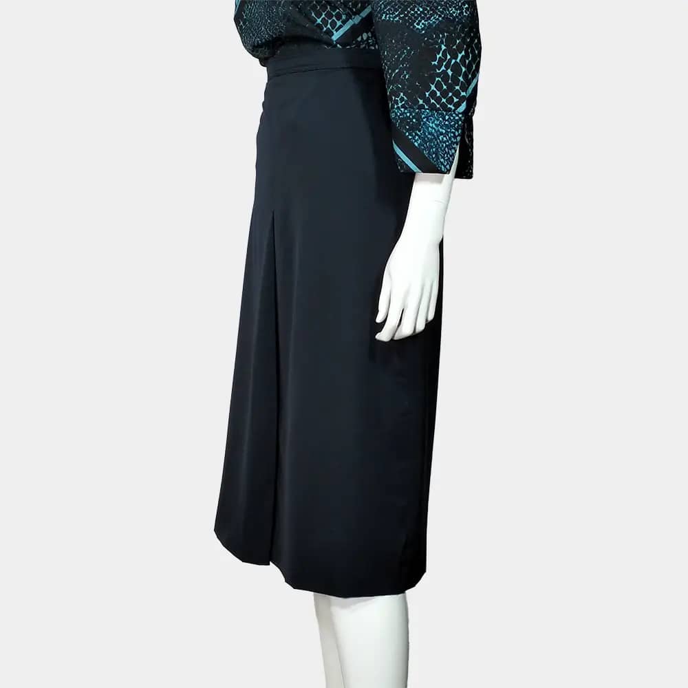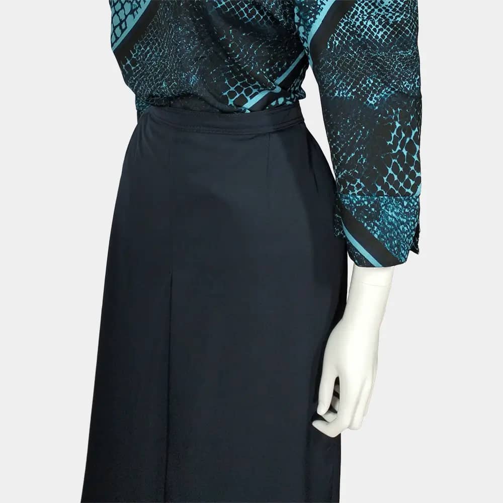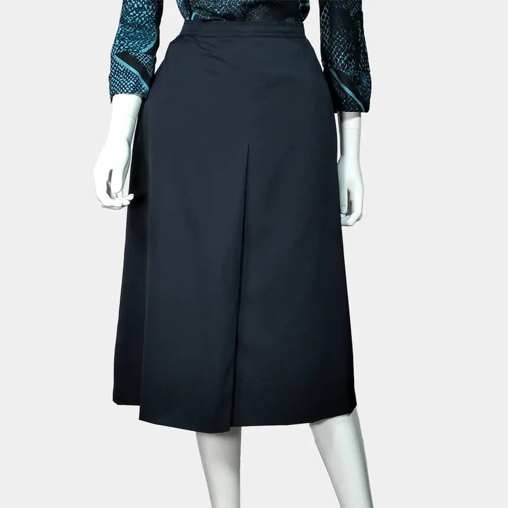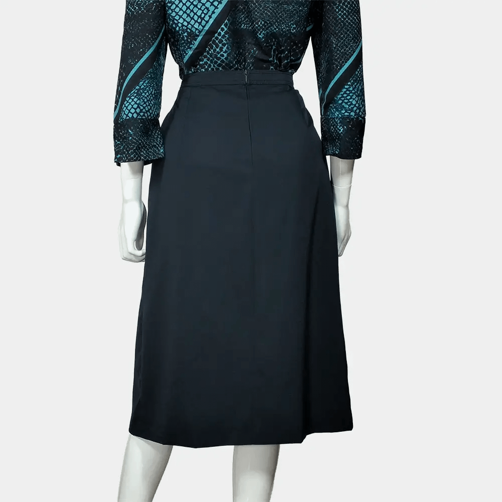 Stylish hammer dark blue skirt in a fabric blend with an inch waistband for a secure fit, and invisible zip at the back. The style is long and lightly flared.