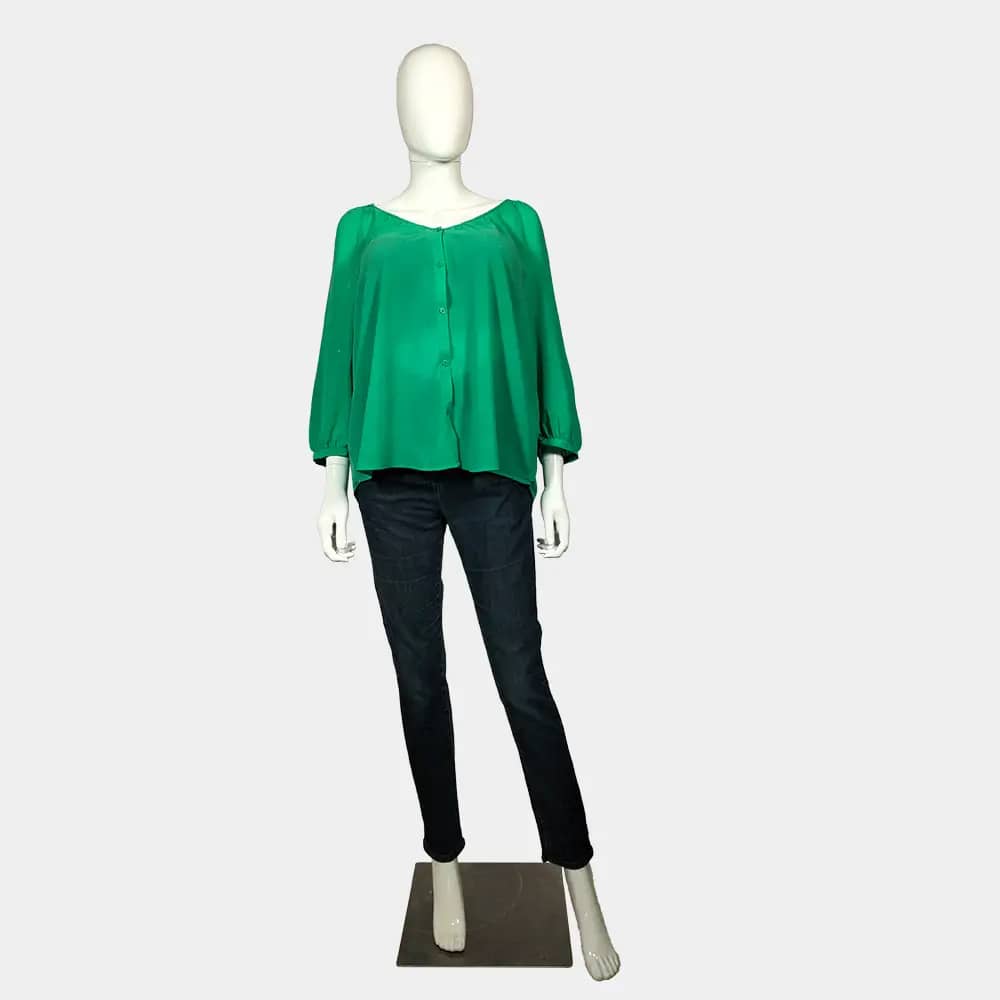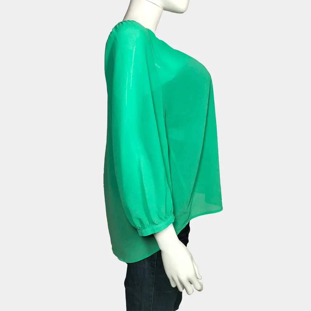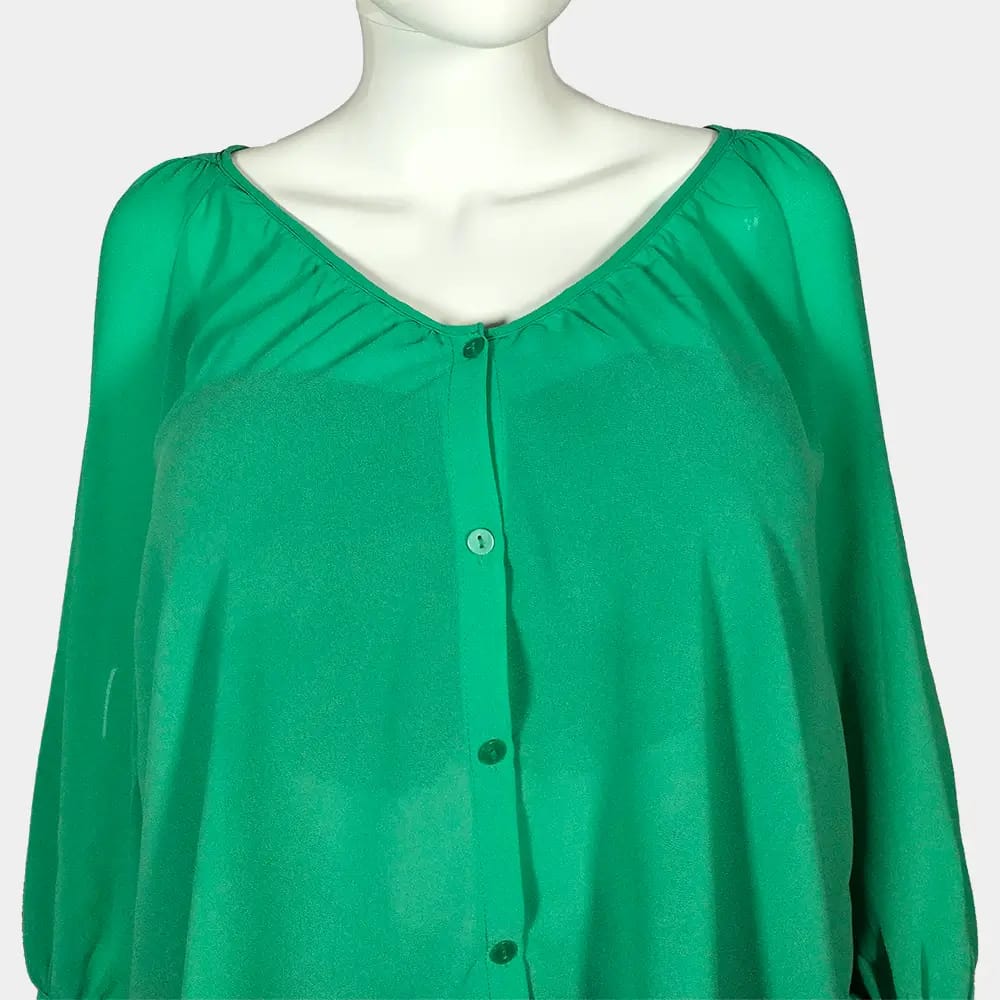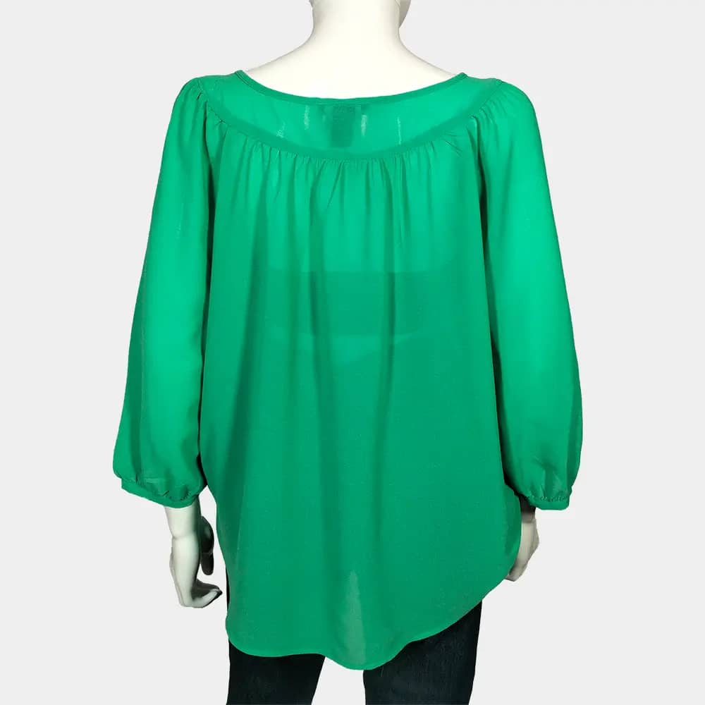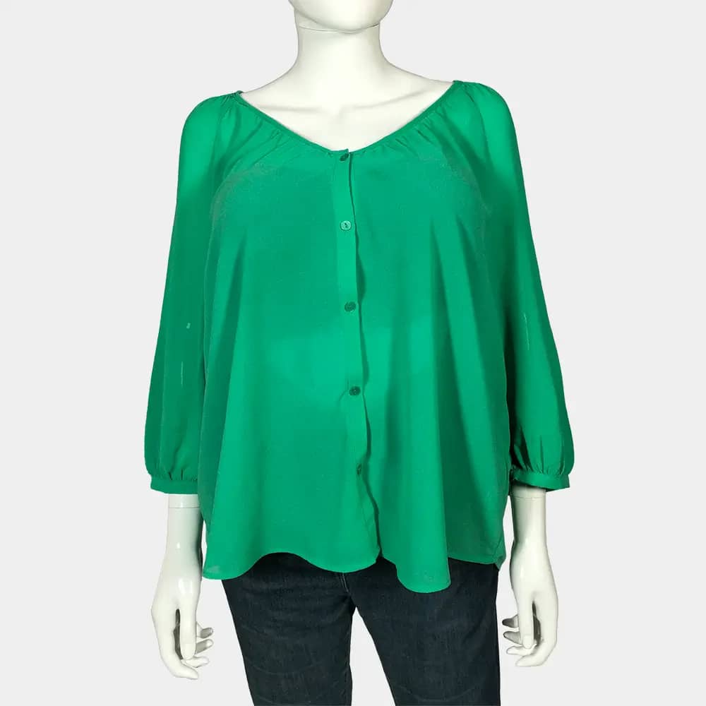 Boxy-style H&M top in 100% polyester/chiffon with a boat neckline and raglan/peasant sleeves.