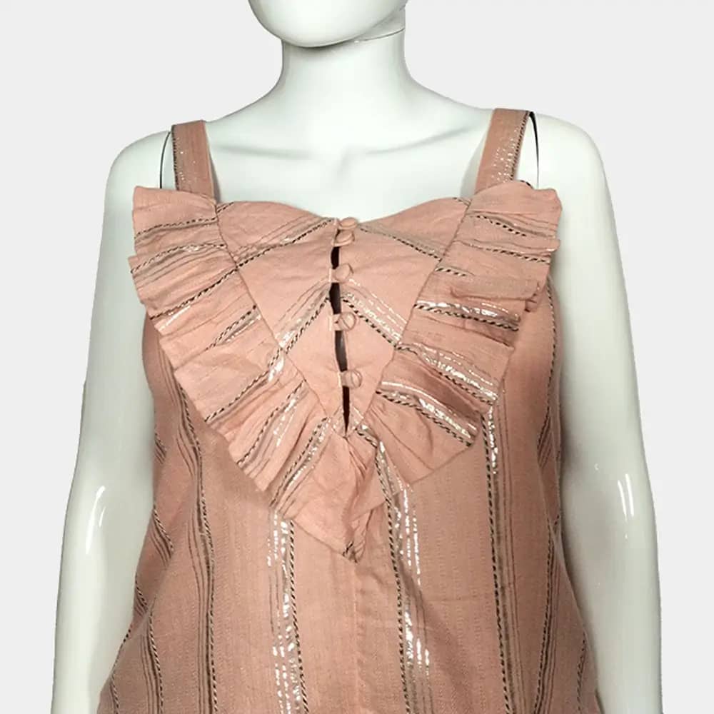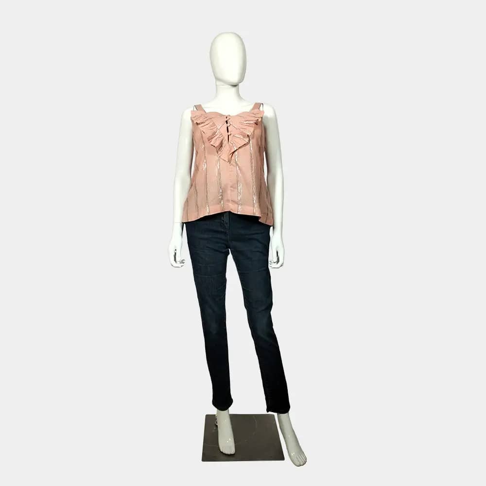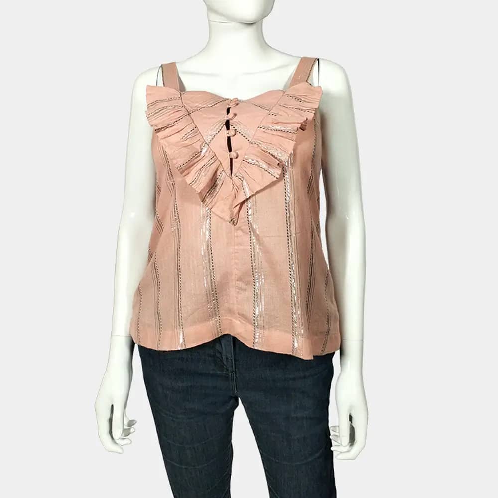 A must-have Next ruffle placket top. This is a 5 button placket with decorative ruffles by the side. The neckline is square with a straight hemline; material is a 100% viscose.