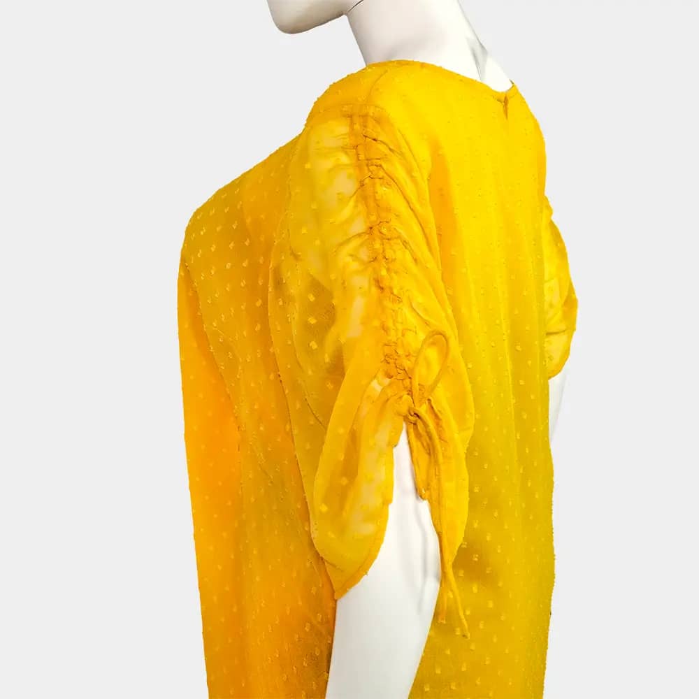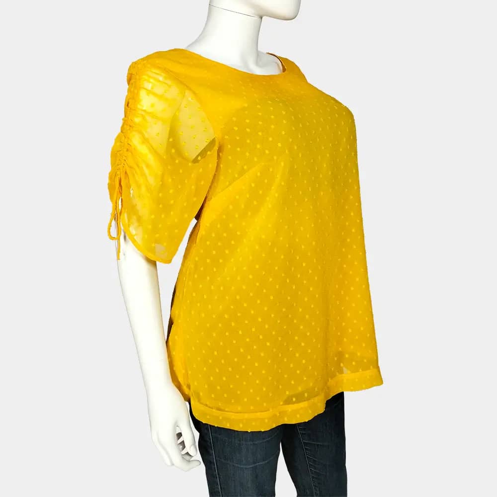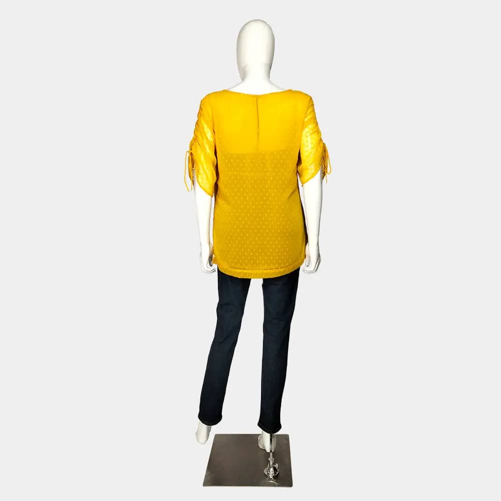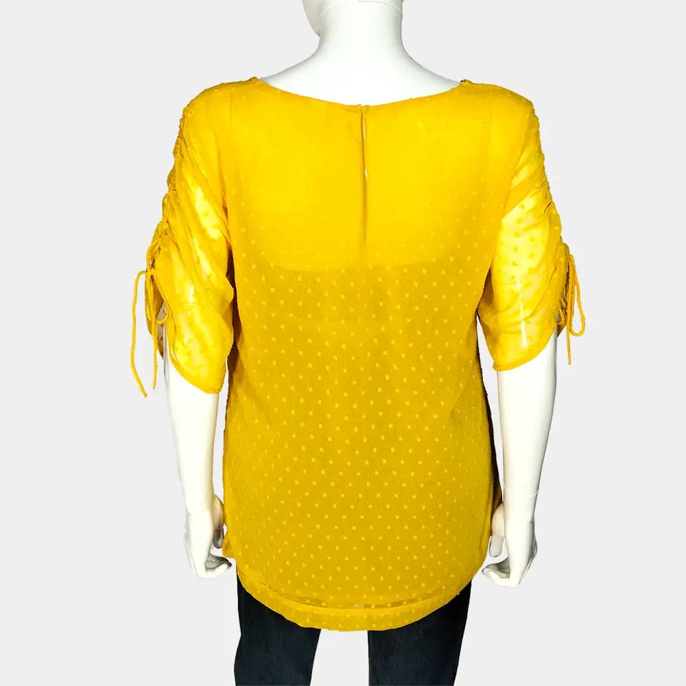 This chic Mama H&M chiffon top features drawstring sleeves to create a ruched effect, straight hem, inner lining, back keyhole neckline, and is a 100% polyester/chiffon material. It should fit a UK 14 large/UK 16 small.