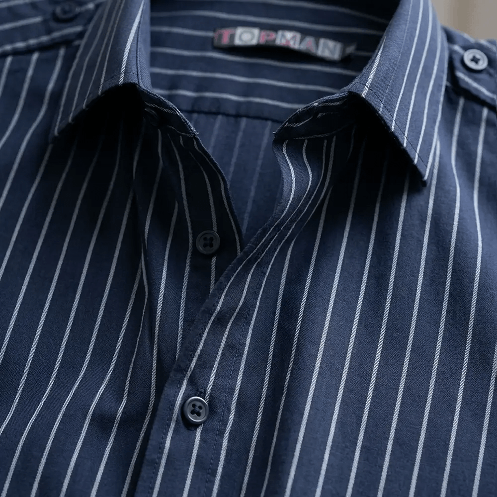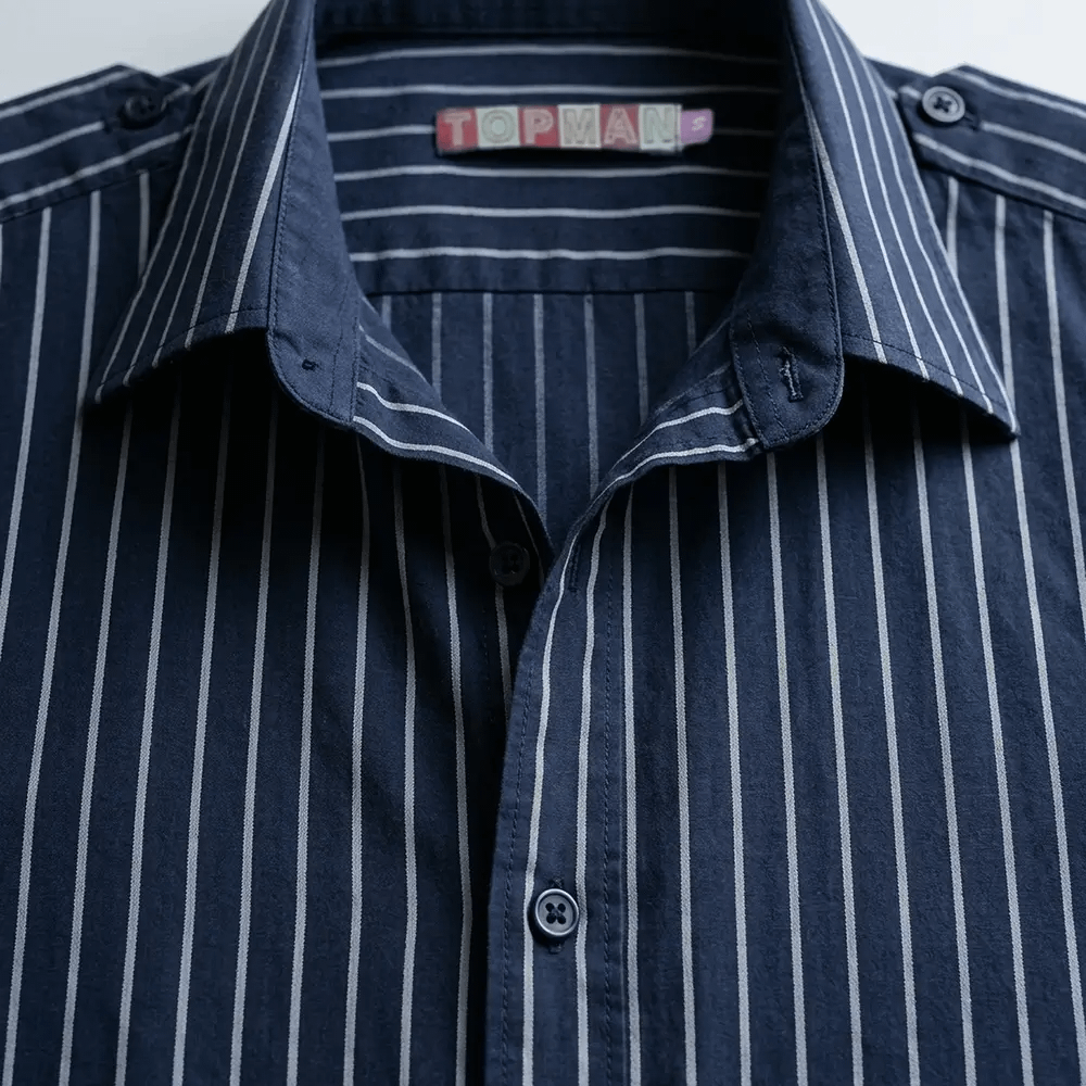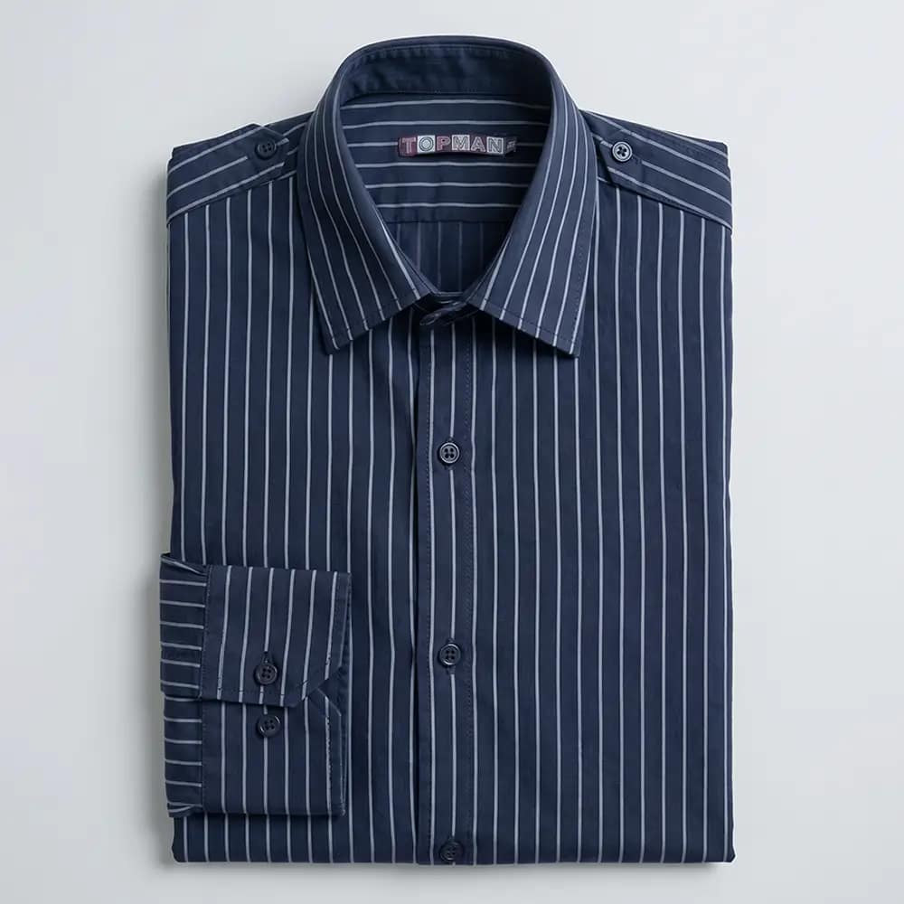 This Navy Striped Topman Men’s Shirt Features a sleek navy base with refined vertical pinstripes, this slim fit shirt enhances your silhouette with a flattering tailoring. The structured collar, button-down front, and subtle shoulder epaulettes add a touch of tailored sophistication, making it ideal for both smart-casual and semi-formal occasions.