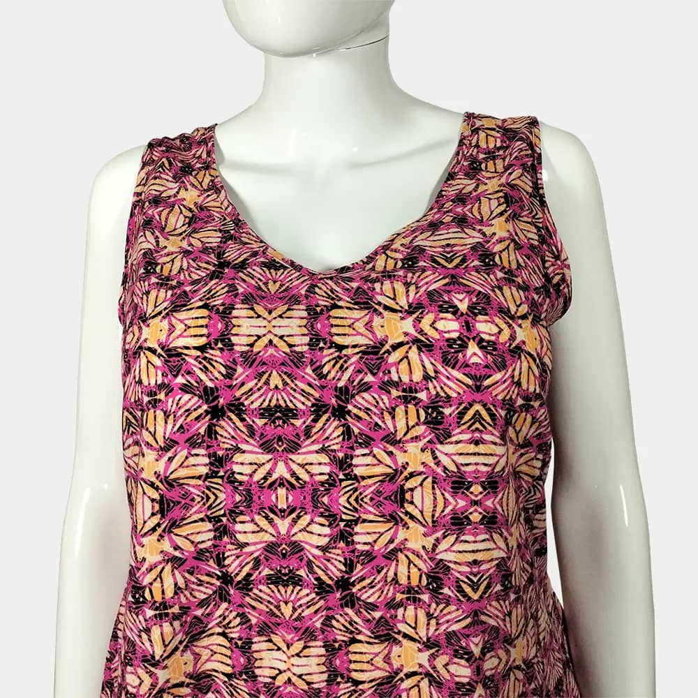 This stylish V-neck New Look sleeveless top is 100% viscose. It features a rounded hemline and a stylish design at the back neckline.