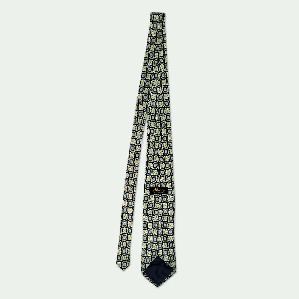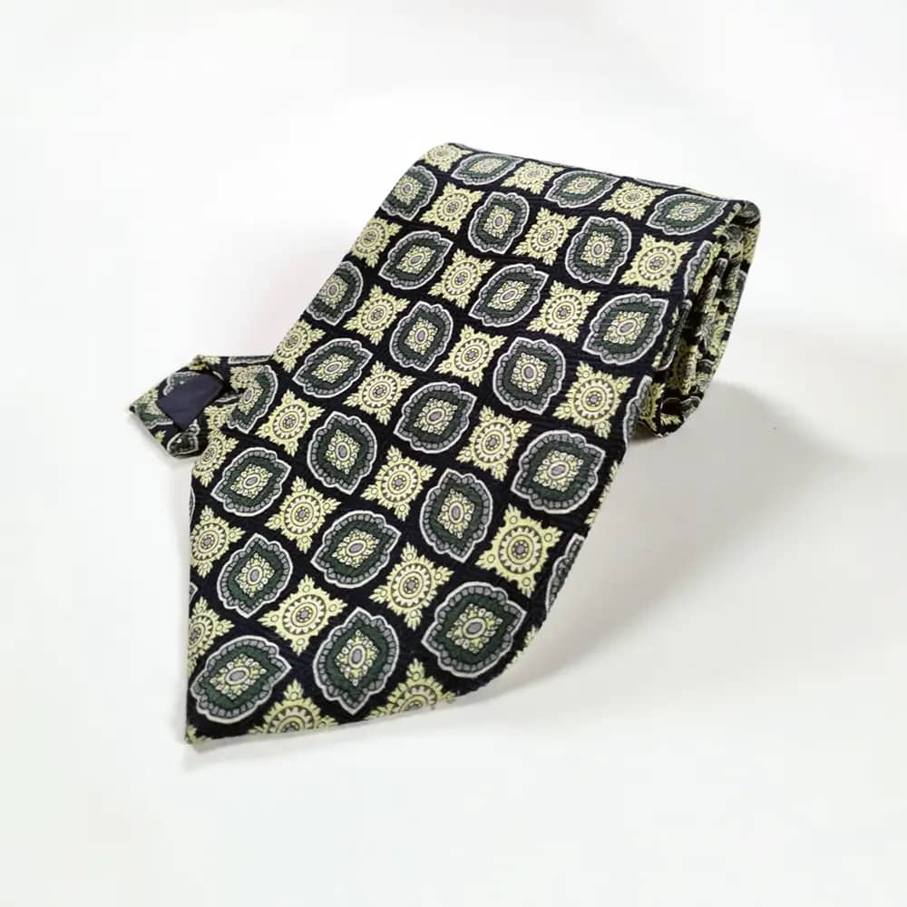 Unique ornate Aluery medallion tie with green & yellow medallion patterns. Fabric is polyester.