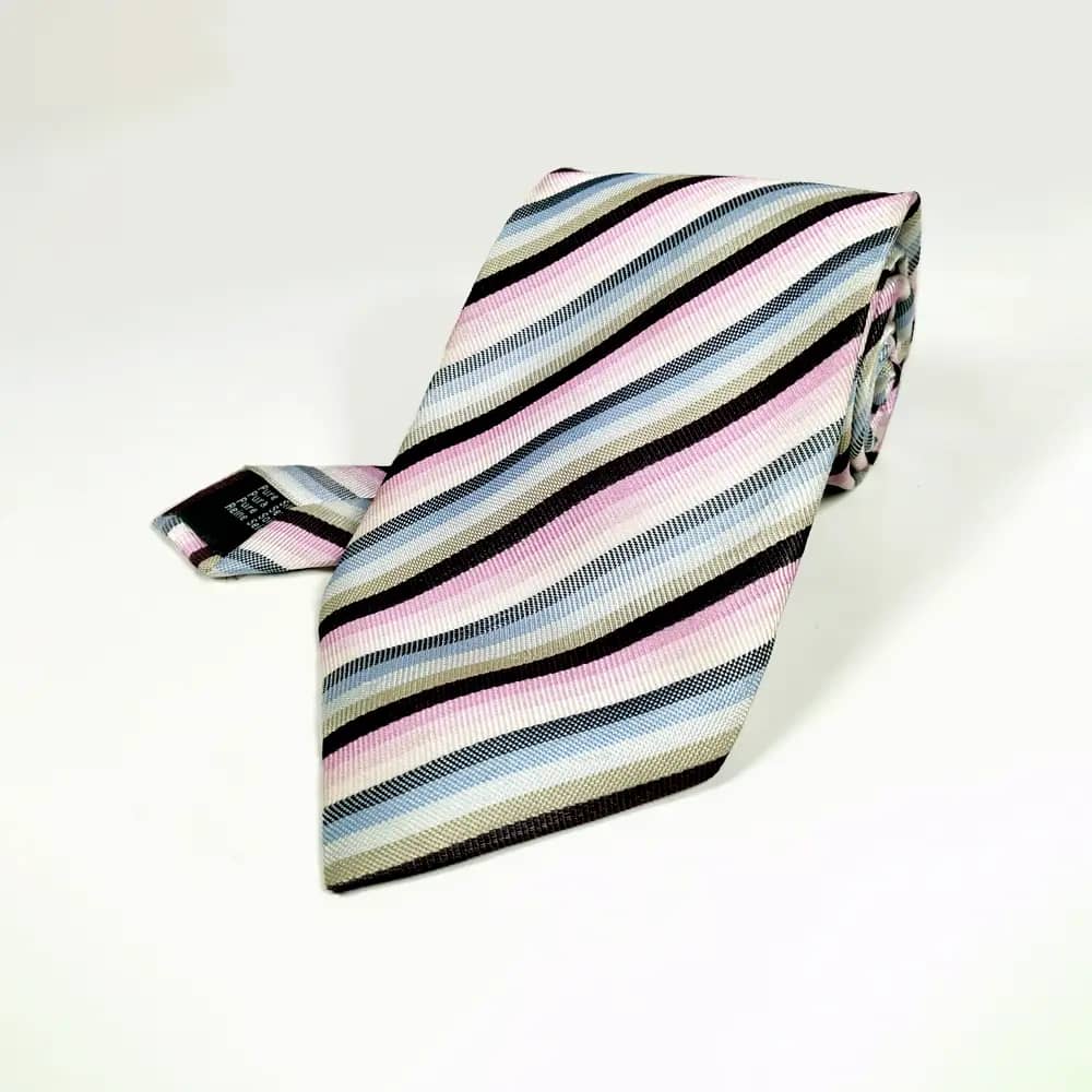 A stylish Batistini silk tie in good condition made of a multi-colored striped fabric with a length of 62 inches.